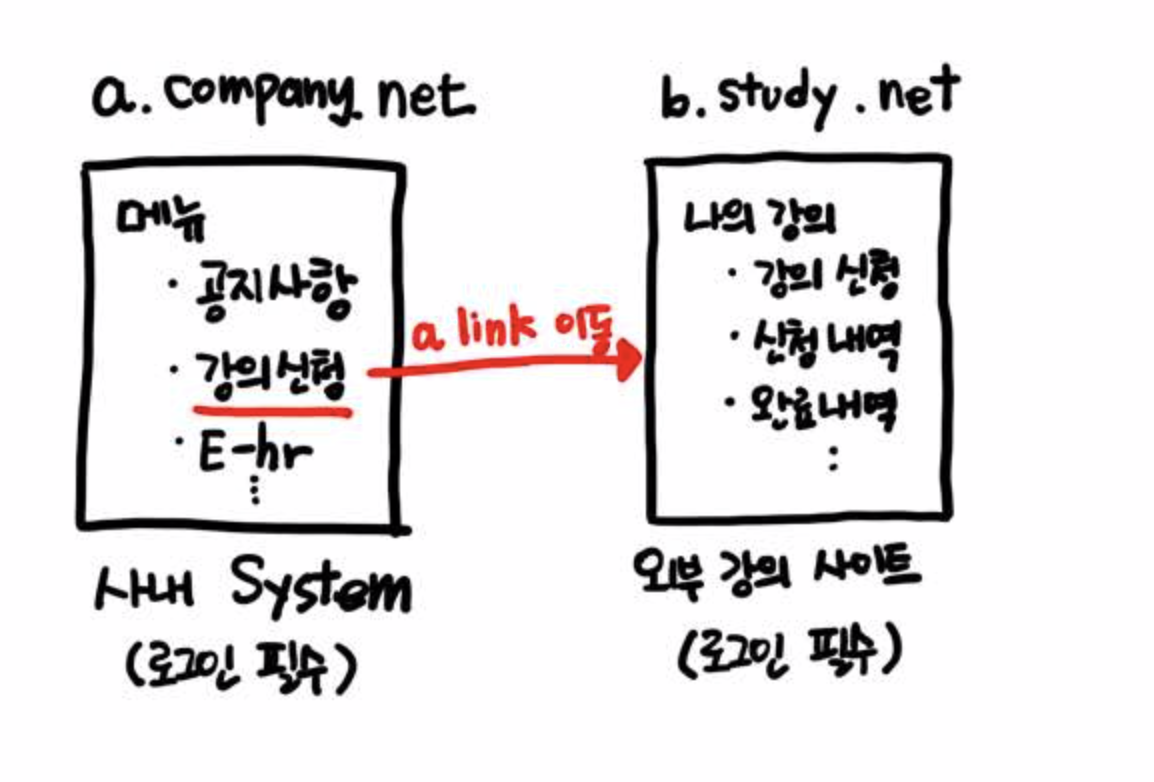 사내 System에 로그인 후 강의신청을 클릭하면 a태그를 통해 외부 강의 사이트로 랜딩된다. 로그인관련 암호화 값은 쿠키를 사용해 공유한다.