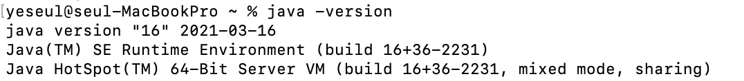 1. 기존 Java버전 확인 (예시는 16버전이 깔려있다)